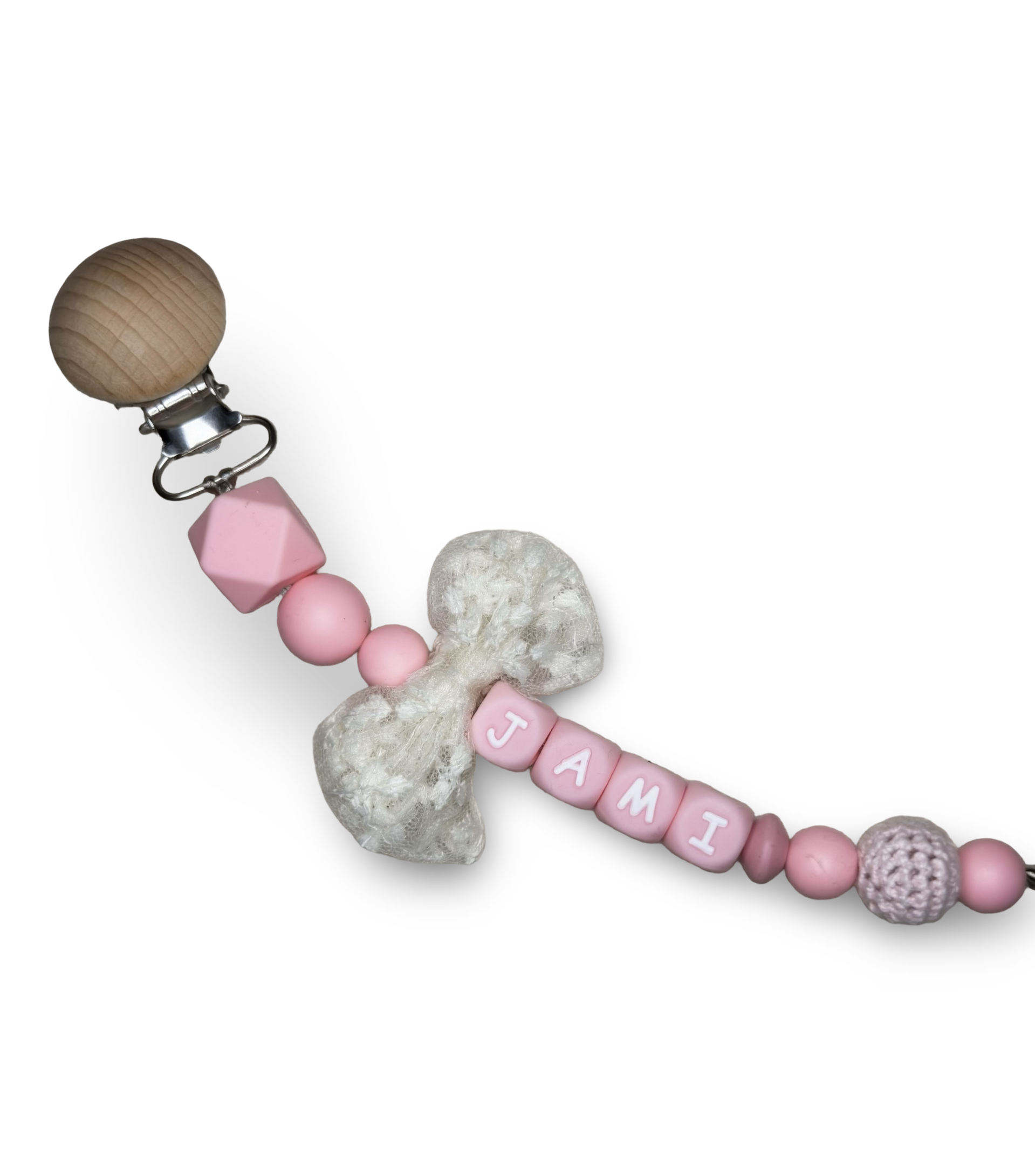 Dit prachtige speenkoord in zachte roze tinten is een echte must-have voor elke babyuitzet. De rustige kleuren in combinatie met natuurlijke houten details zorgen voor een stijlvolle en tijdloze uitstraling die perfect past bij elke outfit.