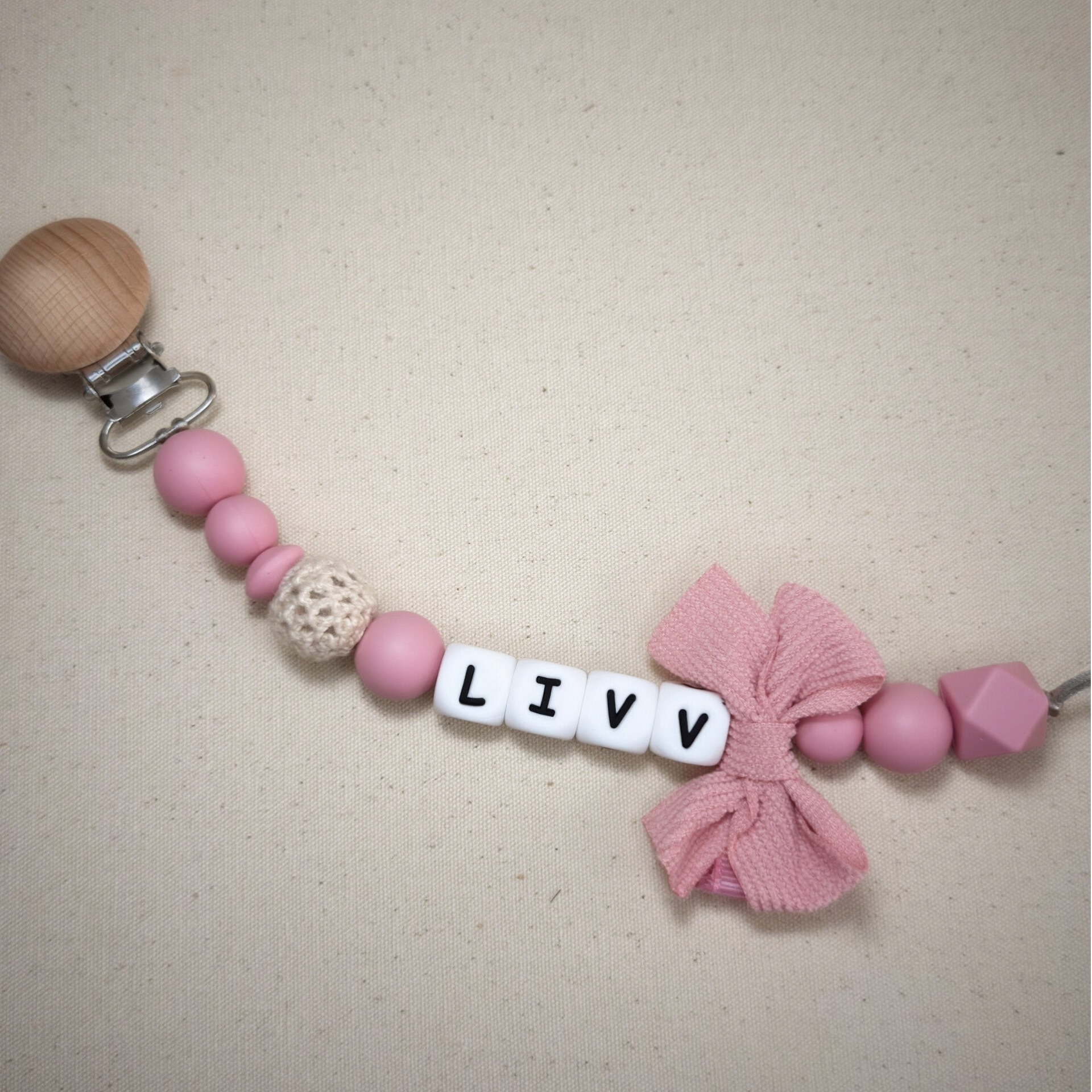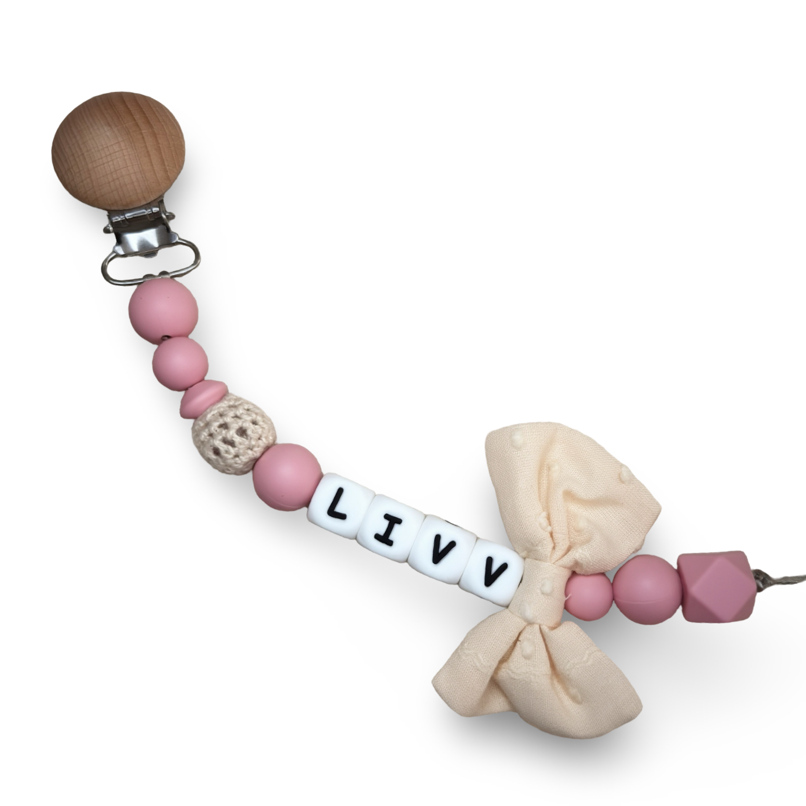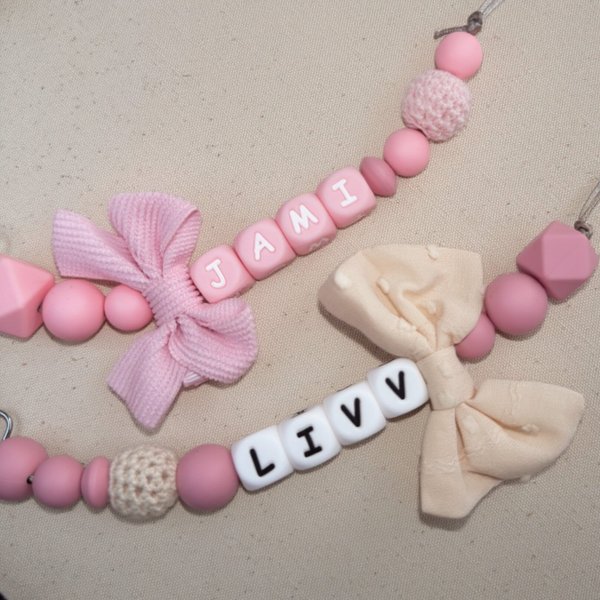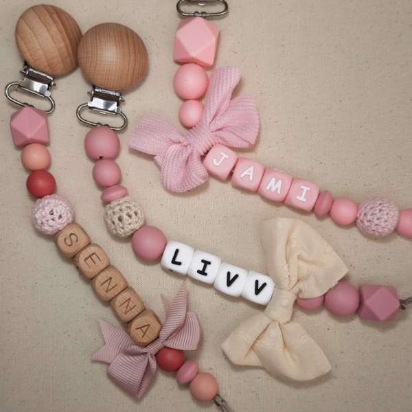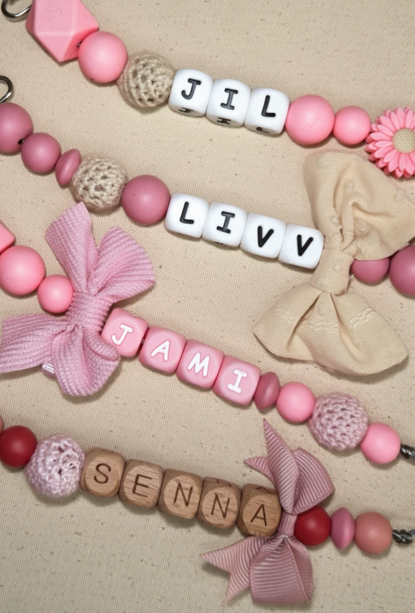 Speenkoord met naam in style 05 bestaat uit zachte roze tinten met een beige toevoeging en een beige strik. Een echte must-have voor elke babyuitzet. De rustige kleur in combinatie met natuurlijke houten details zorgt voor een stijlvolle en tijdloze uitstraling die perfect past bij elke outfit.