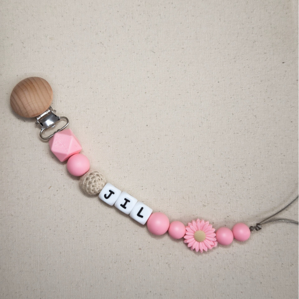Speenkoord met naam in style 07 bestaat uit zachte roze tinten met een roze bloem als toevoeging. Een echte must-have voor elke babyuitzet. De rustige kleur in combinatie met natuurlijke houten details zorgt voor een stijlvolle en tijdloze uitstraling die perfect past bij elke outfit.
