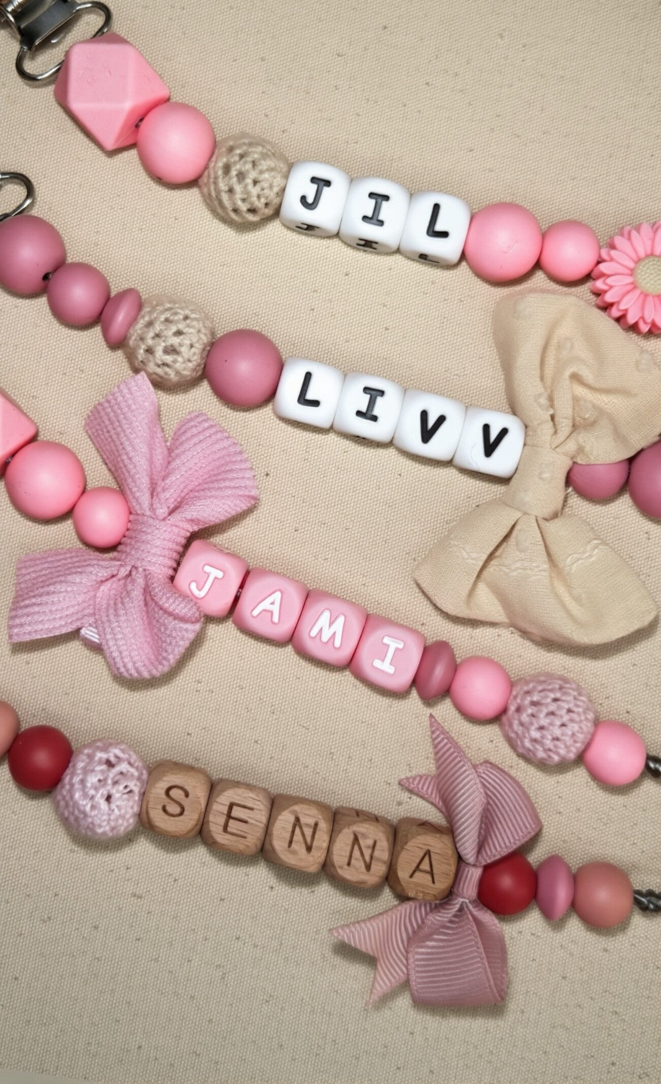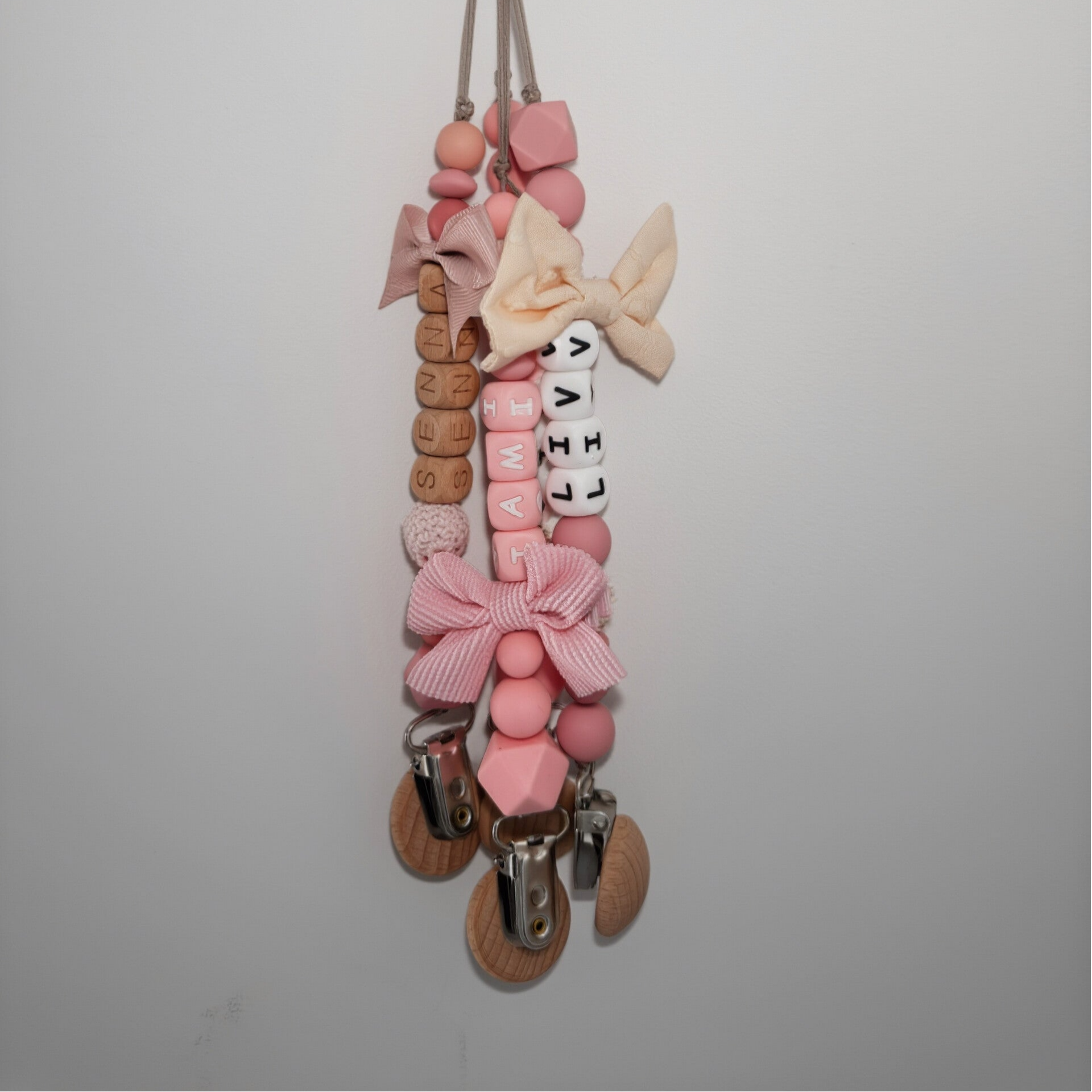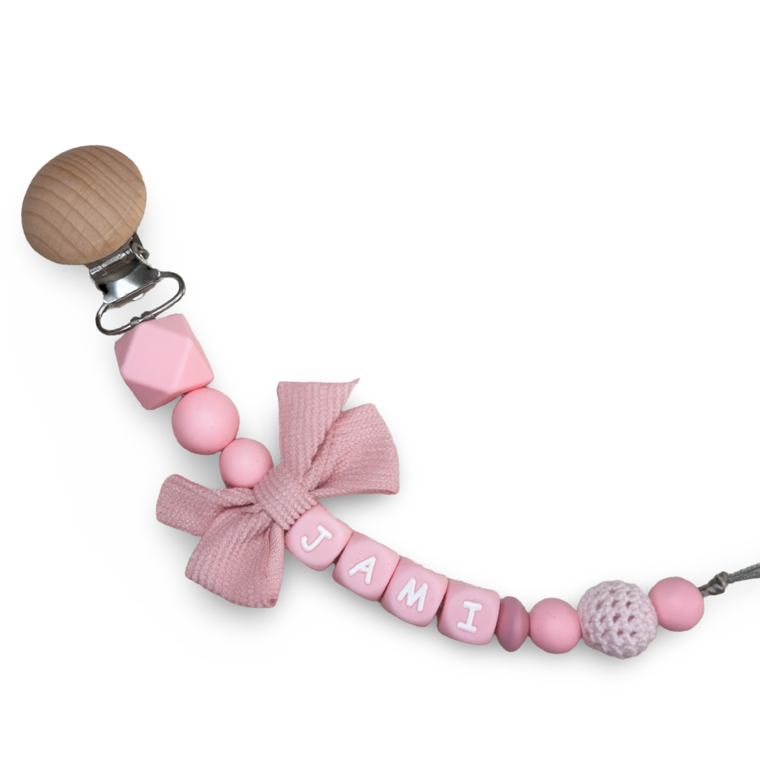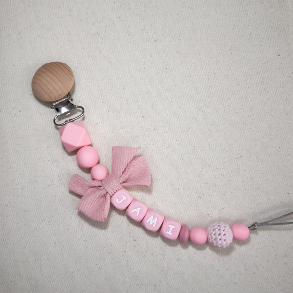 Speenkoord met naam in style 10 bestaat uit zachte roze tinten met een oud roze strik als toevoeging. Een echte must-have voor elke babyuitzet. De rustige kleur in combinatie met natuurlijke houten details zorgt voor een stijlvolle en tijdloze uitstraling die perfect past bij elke outfit.