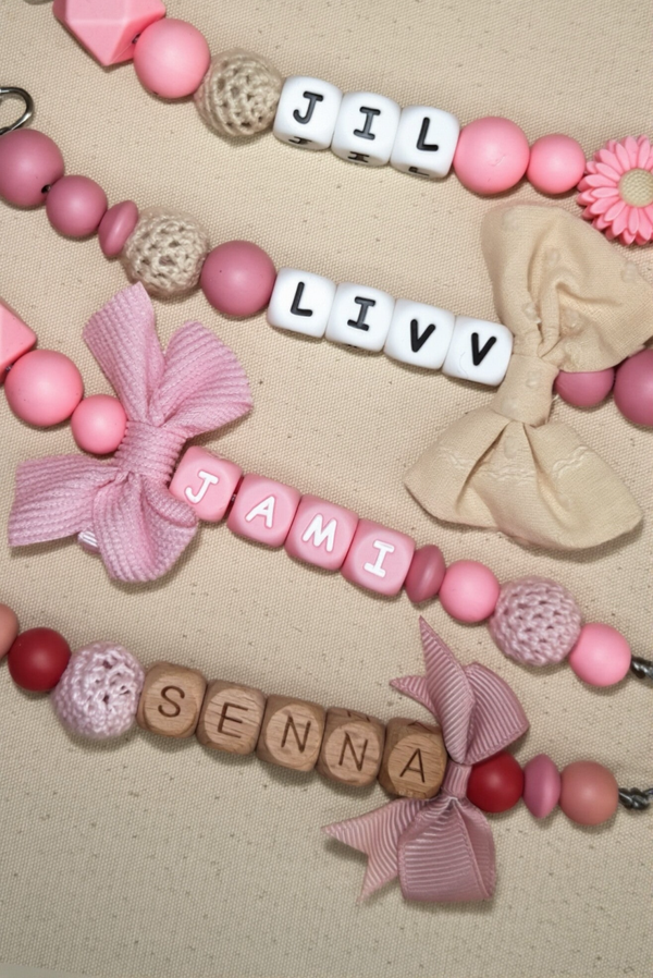 Speenkoord met naam in style 11 bestaat uit zachte roze tinten met een licht roze strik als toevoeging. Een echte must-have voor elke babyuitzet. De rustige kleur in combinatie met natuurlijke houten details zorgt voor een stijlvolle en tijdloze uitstraling die perfect past bij elke outfit.