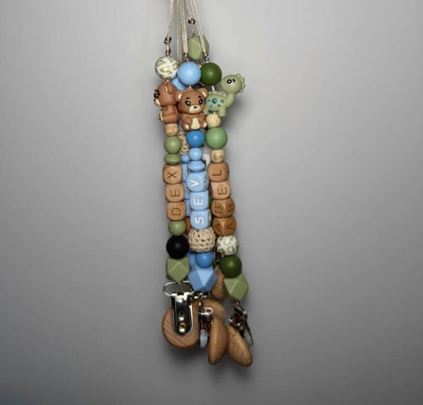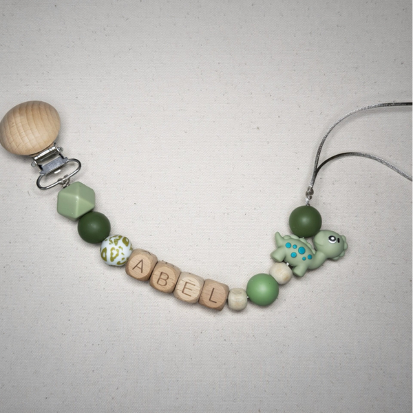 Speenkoord met naam in style 13 bestaat uit jungle groene tinten met een dino als toevoeging. Een echte must-have voor elke babyuitzet. De rustige kleur in combinatie met natuurlijke houten details zorgt voor een stijlvolle en tijdloze uitstraling die perfect past bij elke outfit.