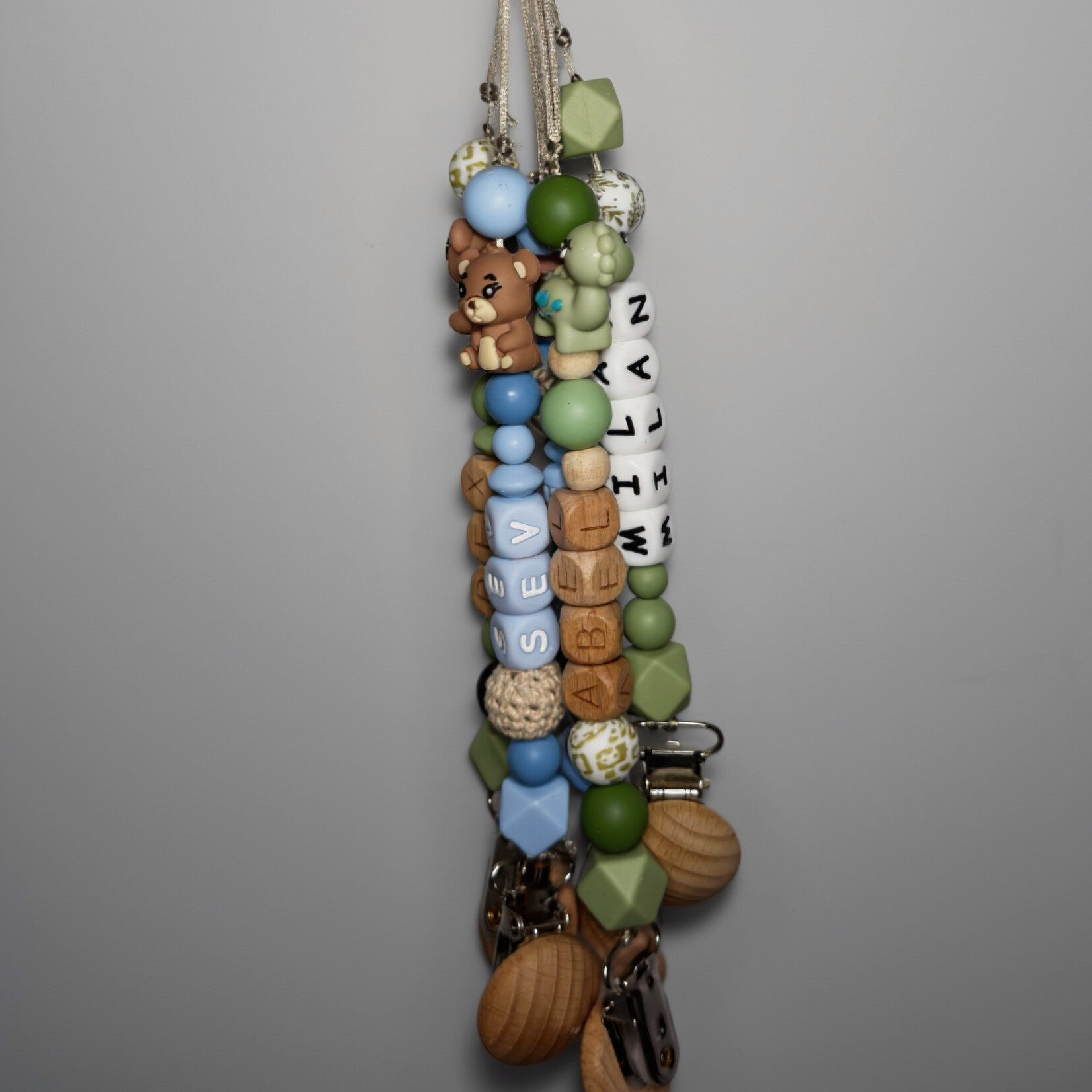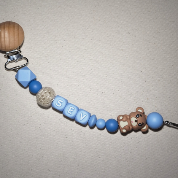 Speenkoord met naam in style 14 bestaat uit blauwe tinten met een beige beertje als toevoeging. Een echte must-have voor elke babyuitzet. De rustige kleur in combinatie met natuurlijke houten details zorgt voor een stijlvolle en tijdloze uitstraling die perfect past bij elke outfit.