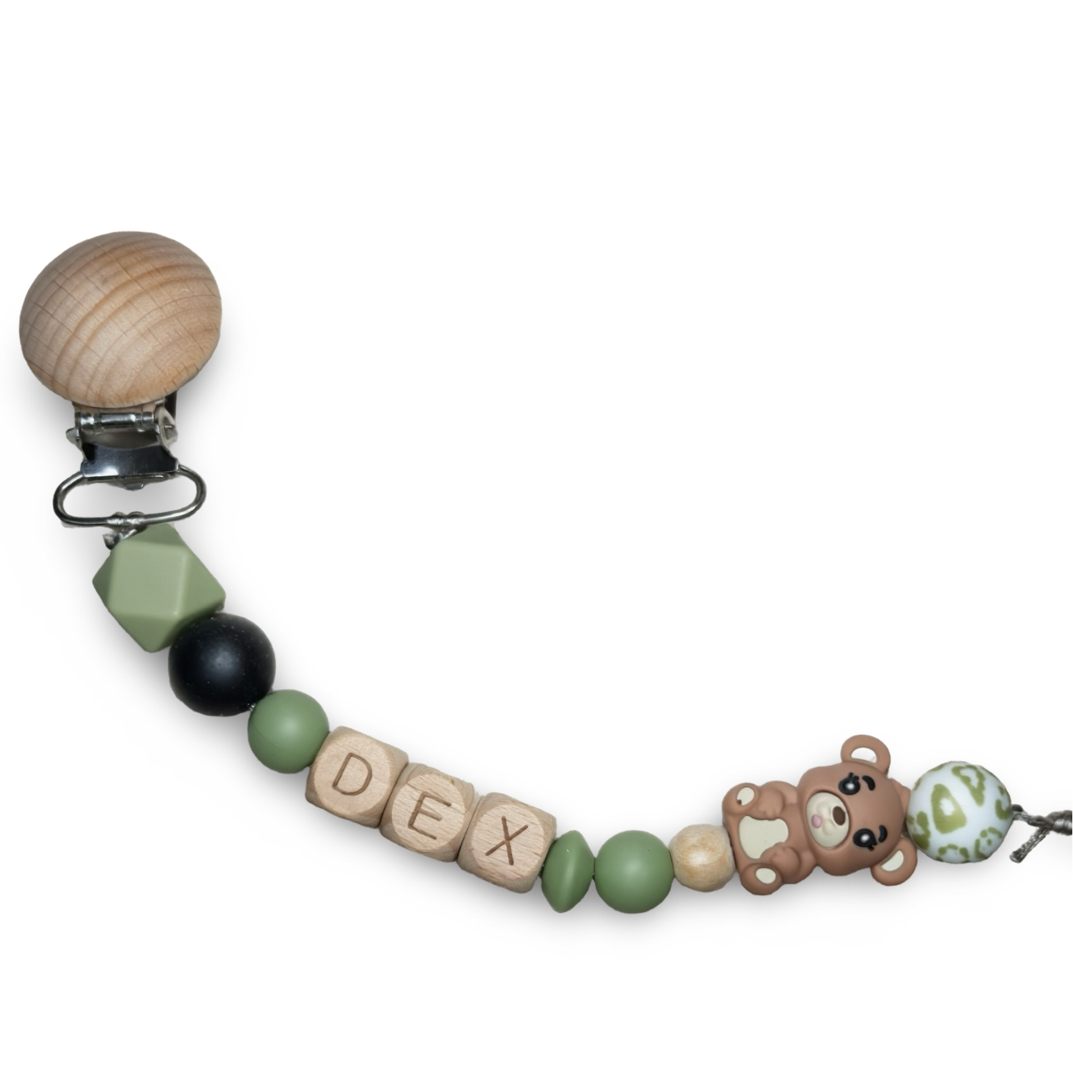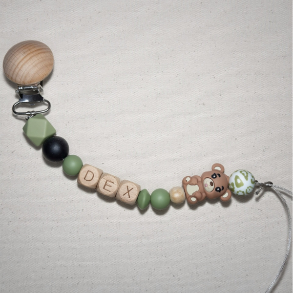 Speenkoord met naam in style 15 bestaat uit groene tinten met een zwarte toevoeging en als afsluiter een bruin beertje. Een echte must-have voor elke babyuitzet. De rustige kleur in combinatie met natuurlijke houten details zorgt voor een stijlvolle en tijdloze uitstraling die perfect past bij elke outfit.
