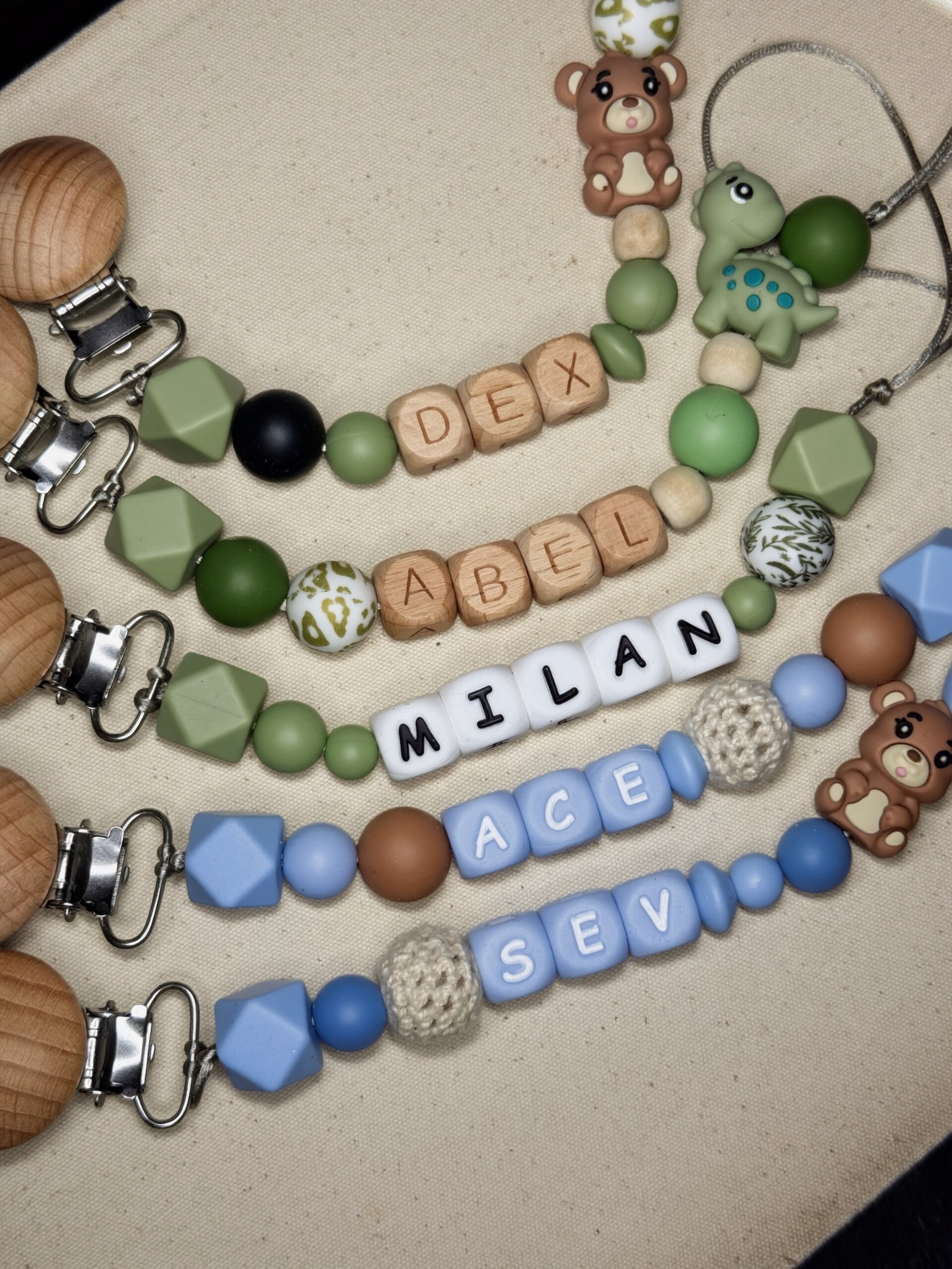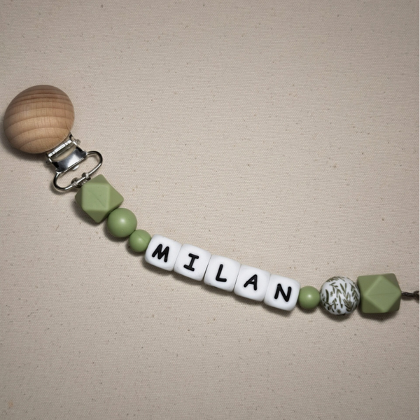 Speenkoord met naam in style 16 bestaat uit groene tinten. Een echte must-have voor elke babyuitzet. De rustige kleur in combinatie met natuurlijke houten details zorgt voor een stijlvolle en tijdloze uitstraling die perfect past bij elke outfit.